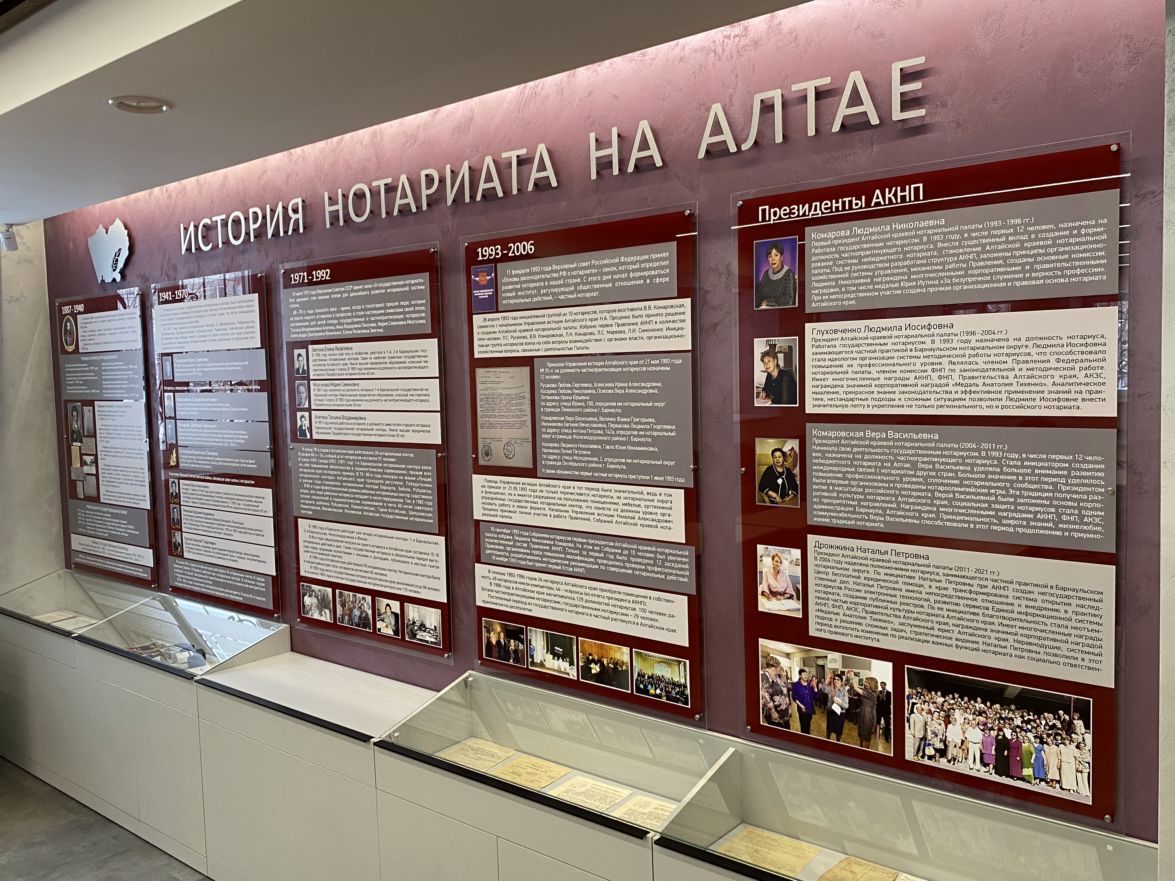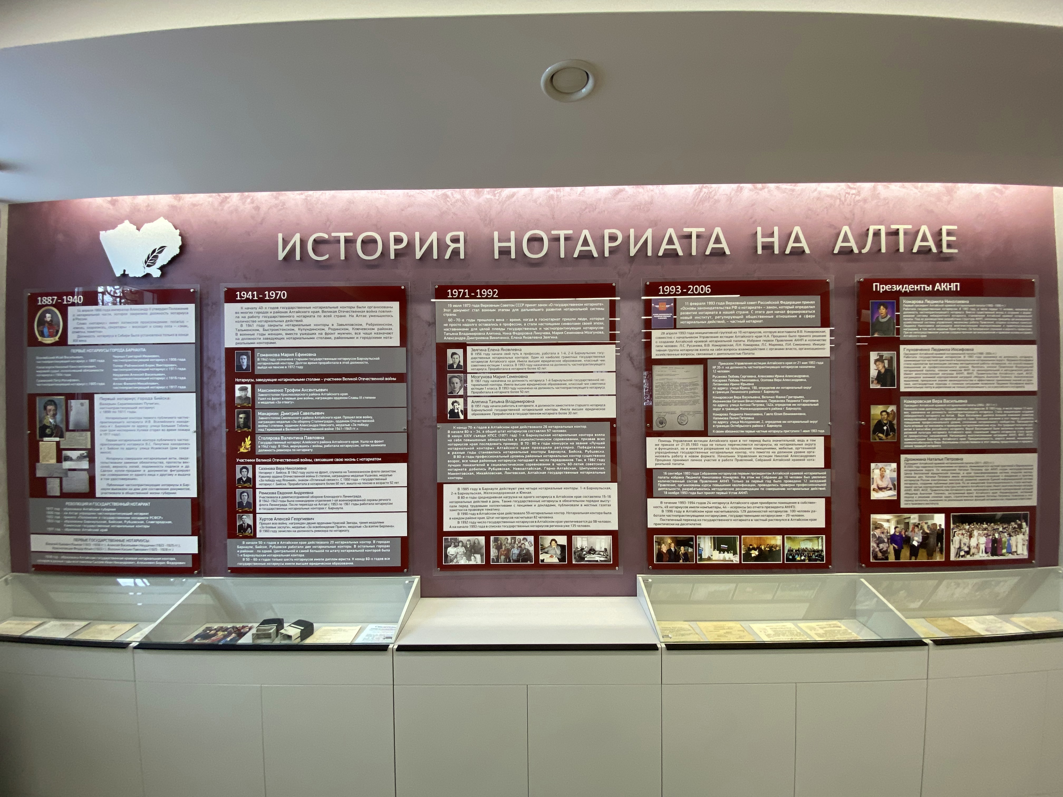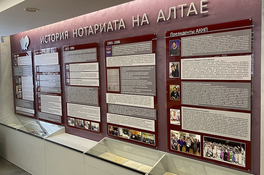 Музей создает галерею имен и событий, через судьбы и документы прослеживается непростая история профессии. В самое ближайшее время музей будет наполнен документами, которые на протяжении нескольких лет собирал Совет ветеранов Алтайской краевой нотариальной палаты.