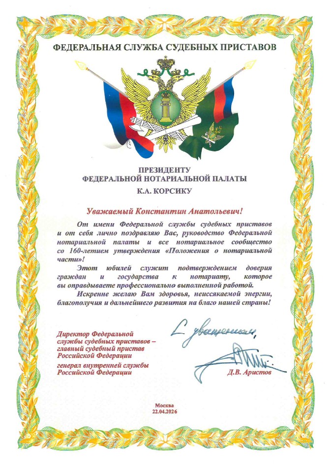 160-летний юбилей служит подтверждением доверия граждан и государства к нотариату, указал в своем поздравительном адресе директор Федеральной службы судебных приставов — главный судебный пристав РФ Дмитрий Аристов. И это доверие нотариусы оправдывают профессионально выполненной работой, подчеркнул он.